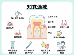 自宅でできる対策としては、知覚過敏用歯みがき粉(硝酸カリウムや乳酸アルミニウム配合)の使用、やわらかめの歯ブラシで優しく磨くこと、酸性飲食物の摂取頻度を見直すことが挙げられます。